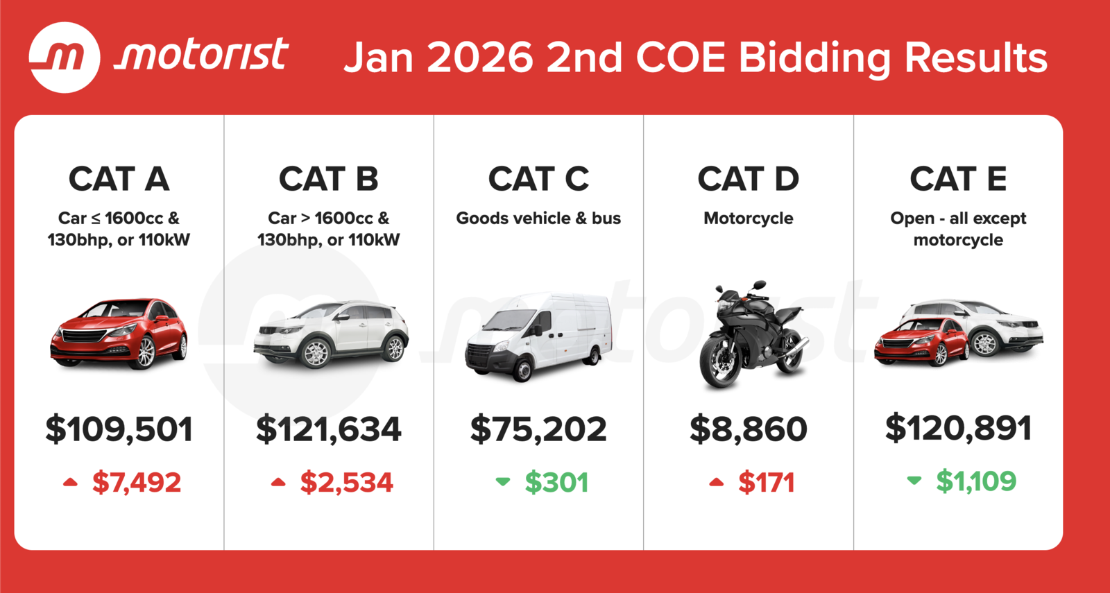 In the second COE bidding exercise of January 2026, Cat A closed at $109,501; Cat B closed at $121,634; Cat C closed at $75,202; Cat D closed at $8,860; while Cat E closed at $120,891.